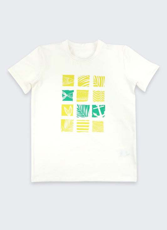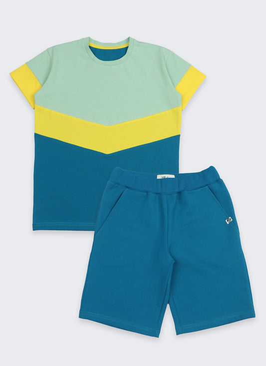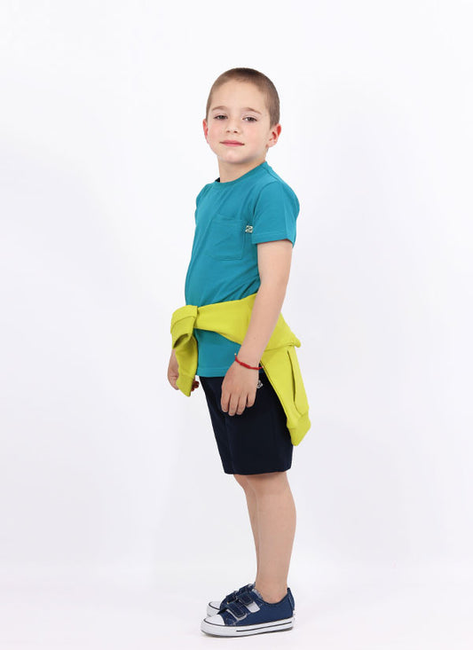 • Комплект с цветни платки се състои от тениска в цвят аква с вертикални платки в ярко жълт цвят и къс панталон с класически силует в цвят аква и цветни платки в ярко жълт цвят разположени аналогично на тениската, Момчета 2 - 10 години, Zinc