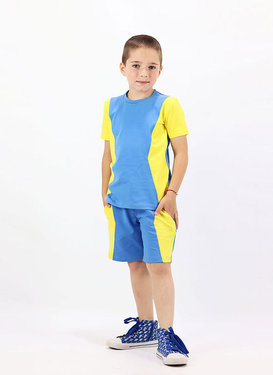 • Спортна риза и къс панталон е комплект, който се състои от риза от трико в сив меланж с цветни платки по диагонал в звънливо жълт цвят и тъмно синьо и класически къс панталон в тъмно син цвят, Момчета 2 - 5 години, Zinc