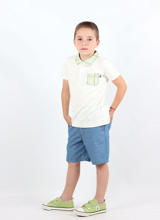 • Риза с джоб и къс дънков панталон e комплект от риза от трико в екрю с кариран джоб, с две копчета на деколтето и яка и къс панталон с ластик на талията и копче, два странични джоба и подгъв на крачолите, Момчета 3 - 12 години, Zinc