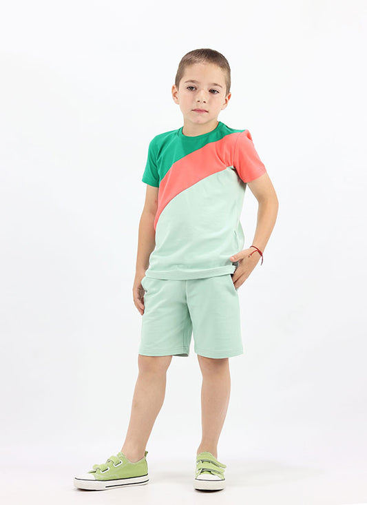 • Тениска с цветни платки + къс панталон е комплект от класически къс панталон в цвят млечна мента и тениска с асиметричен дизайн в млечна мента с цветни платки по диагонал в горната част в бг зелен цвят и корал, Момчета 2 - 10 години, Zinc