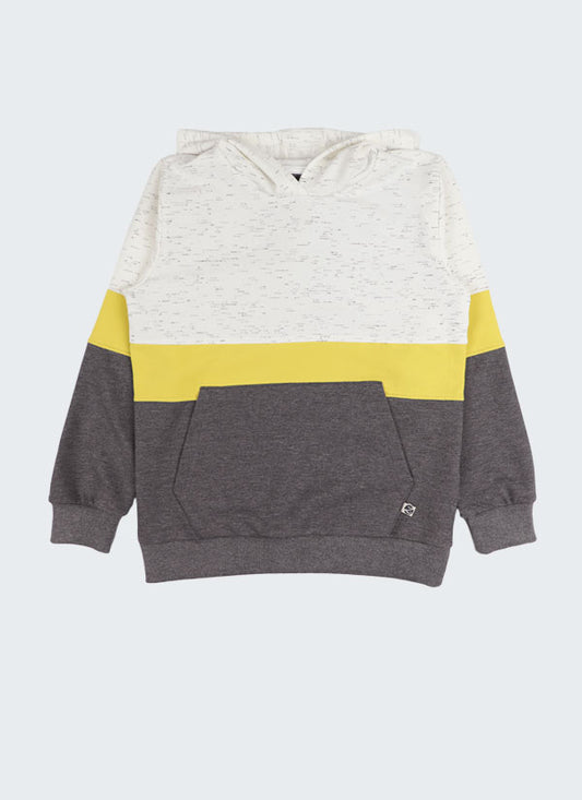 • Ватиран суитшърт в три цвята - модел с голям преден джоб, маншети на ръкавите и колан на талията. Предната част е разделена на три и всяка е в различен цвят - бял меланж, патешко жълт и графит меланж, Момчета 2 - 12 години, Zinc
