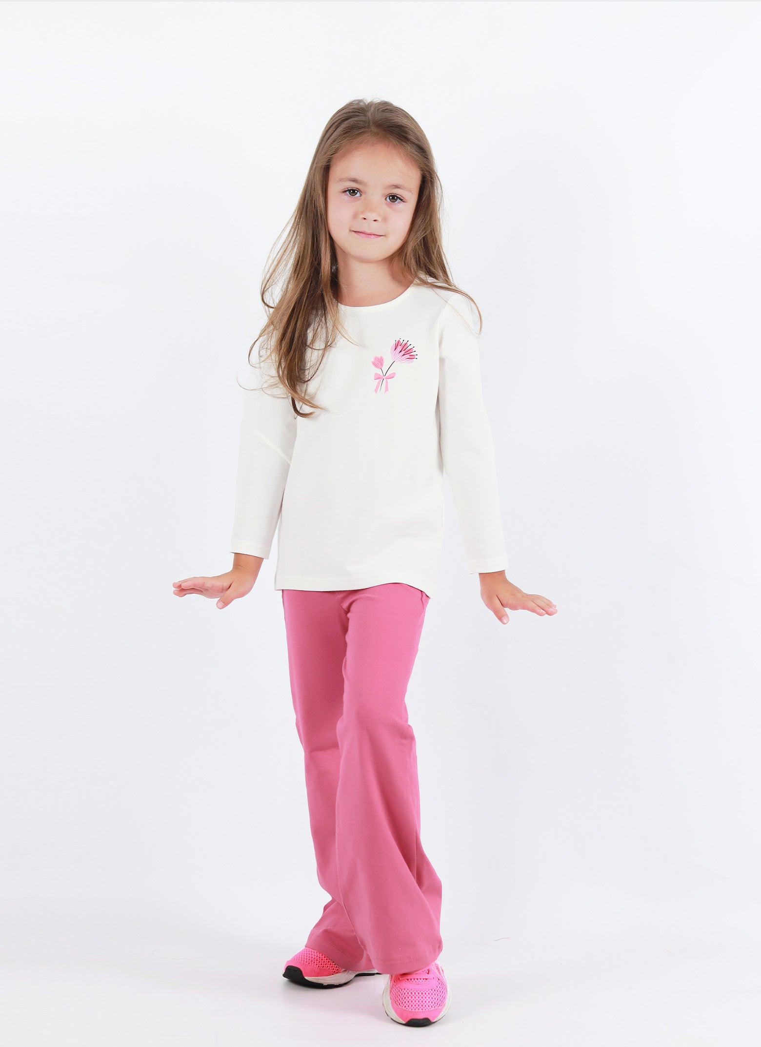 Блуза с цвете и плътен клин-панталон създадохме от приятен памук сертифициран с OEKO-TEX Standard 100. За стилни малки госпожици комбинирахме тънка блуза с принт и плътен клин-панталон с клоширани крачоли. Така получаваме една завършена елегантна и удобна визия за детското ежедневие. Може да носите в комплект или успешно да съчетавате с други блузи, туники и клинове.