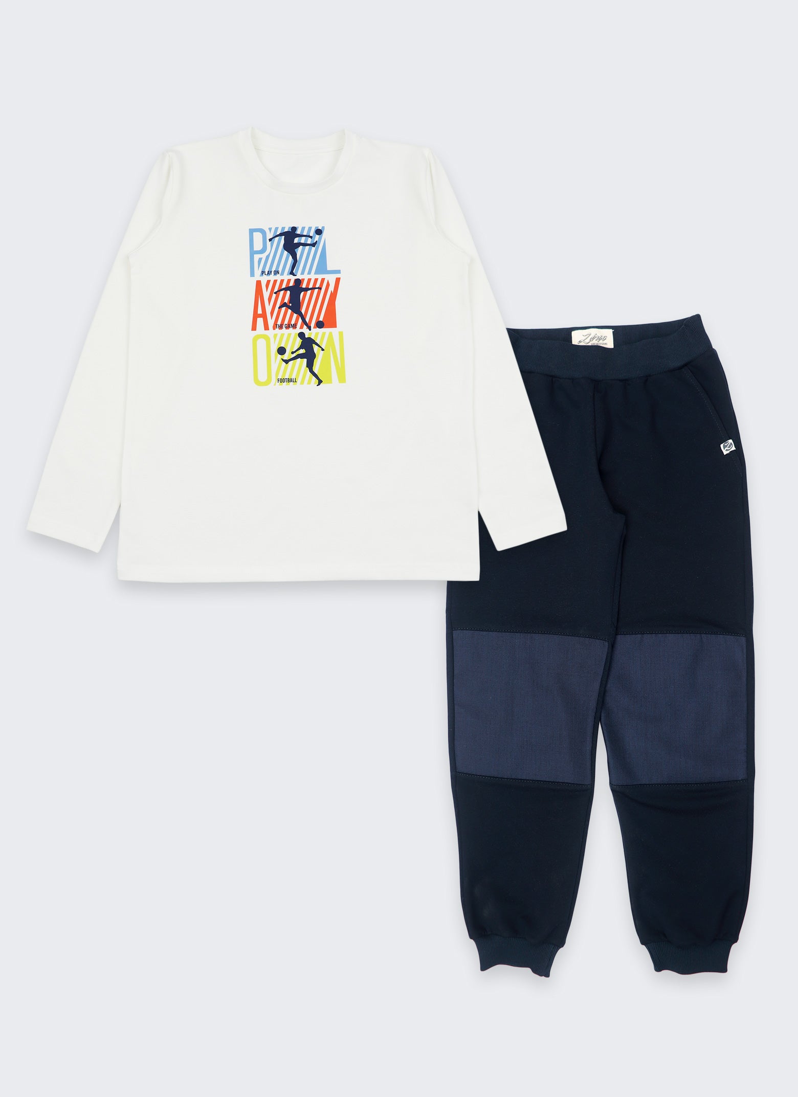 Блуза с принт и тъмно синьо долнище с подсилени коленe от силно издръжлив плат Ripstop - високоякостна тъкан, при която нишките се усукват, така че да подсилят структурата на плата, като го направят по-устойчив на разкъсване. Блузата и долнището са от мек сертифициран памук, OEKO-TEX Standard 100. Моделът е чудесен за игри навън или тренировки в зала.