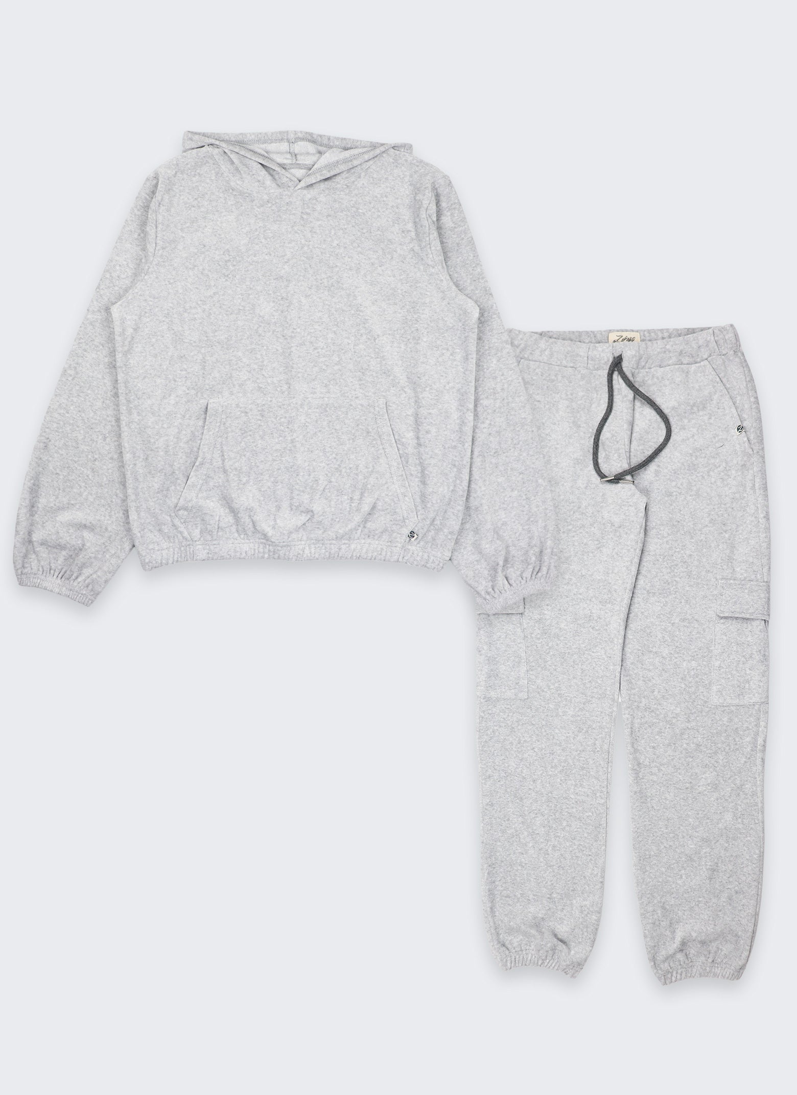 Дамски комплект от плюш е изработен от мек сертифициран памук, OEKO-TEX Standard 100, много мек и приятен на допир. Комплектът е подходящ за студените зимни дни. Суитшъртът е класически модел с ластик на ръкавите и талията, голям джоб тип кенгуру отпред и качулка. Долнището е с класическа кройка с ластик на талията и крачолите и добавени два странични джоба с капак. Може да обличате в комплект или да съчетавате поотделно с други дрехи от гардероба си.