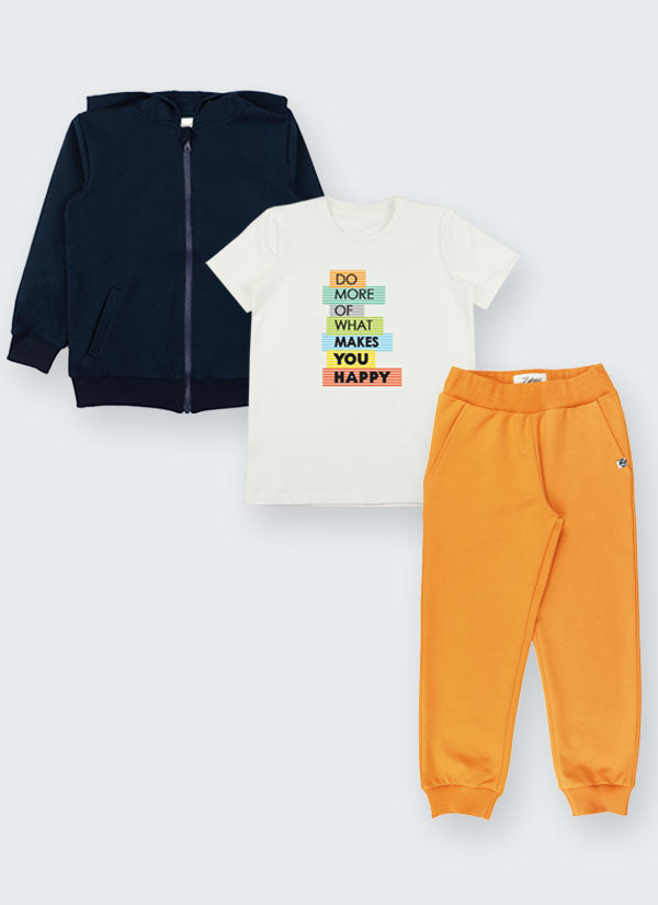 Комплект от 3-и части е подходящ за детското ежедневие. Създадохме го от мек и приятен на допир сертифициран памук, OEKO-TEX Standard 100. Знаем колко е важен избора на дрехи и съчетанието на цветове, за да постигнете една завършена визия. Комбинирахме суитшърт, тениска и класическо долнище. Така сте напълно готови за детска градина, за безброй приключения и щури игри. Може да обличате в комплект или да съчетавате поотделно с други дрехи.