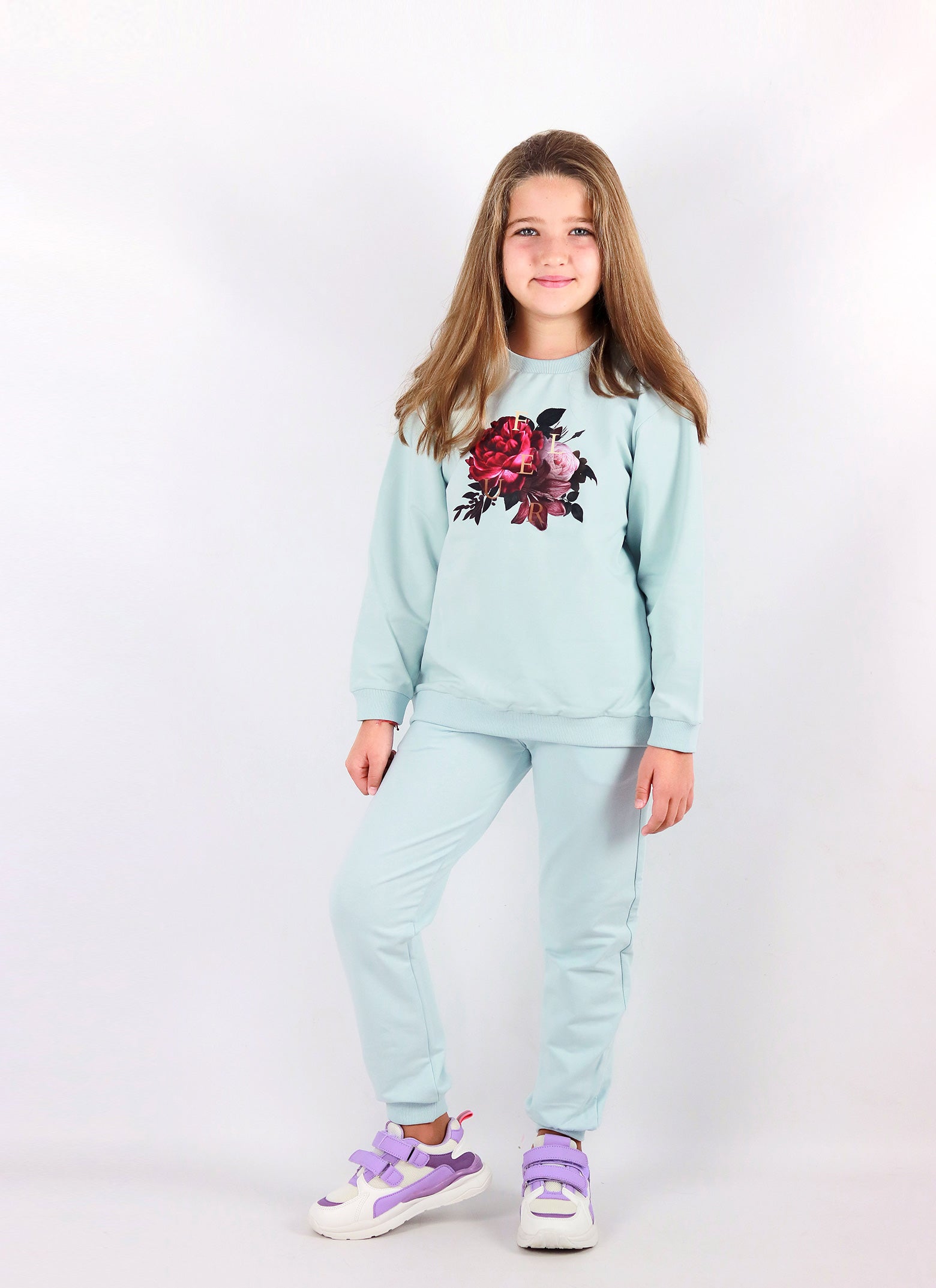 К-т суитшърт с цвете и долнище направихме от сертифициран памук с OEKO-TEX Standard 100. Материалът е т. нар. лека вата - много подходящ за по-хладните дни, удобен и комфортен. Съчетахме суитшърта с класическо долнище за елегантна спортна визия, която е подходяща за училище, разходки и весели игри навън. Може да обличате в комплект или лесно да комбинирате с други дрехи от гардероба си.