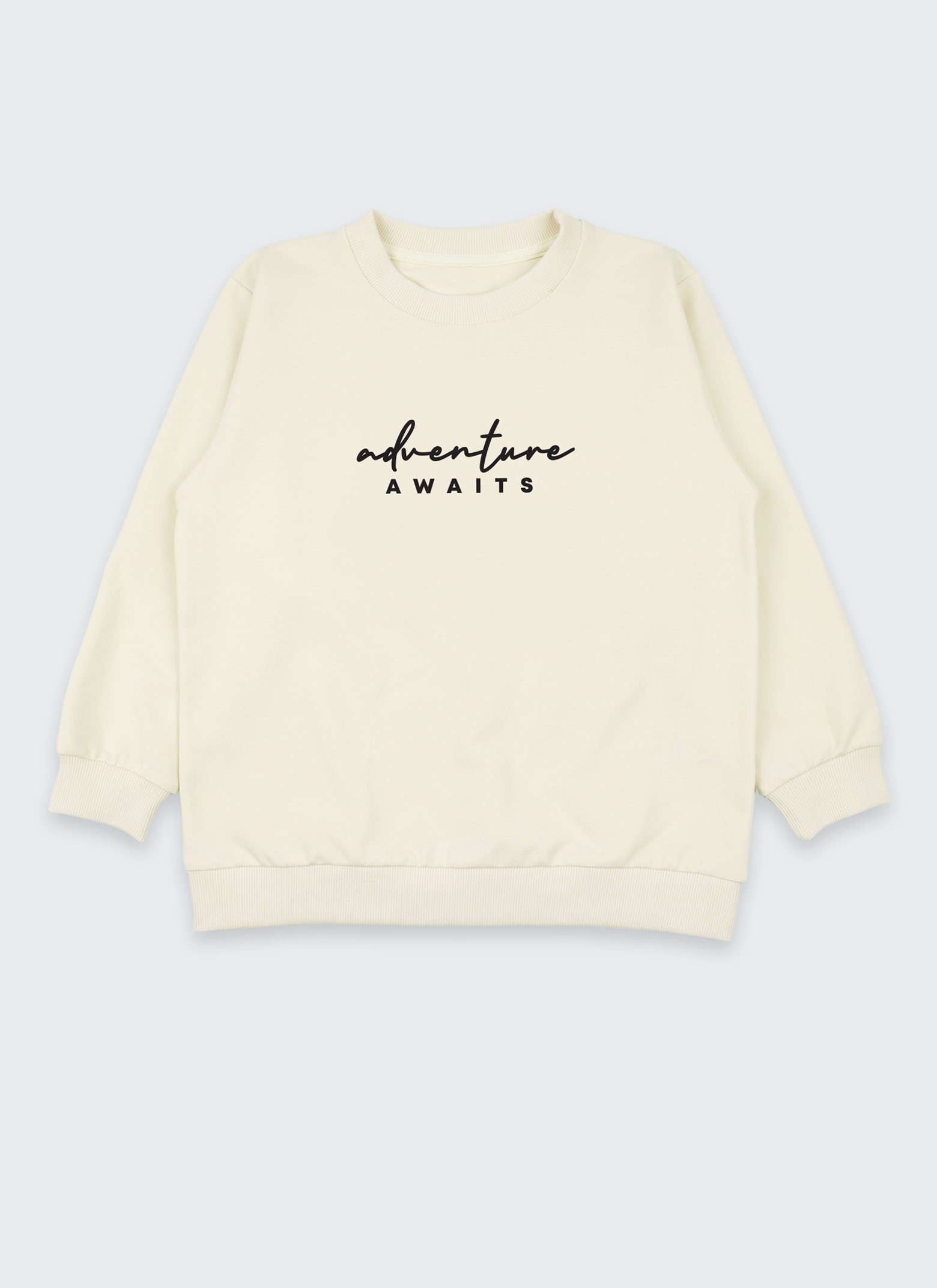 Суитшърт с принт от лека вата изработихме от мек и приятен на допир памук, сертифициран с OEKO-TEX Standard 100. Удобен спортен суитшърт със принт "Adventure awaits", който е чудесно попълнение за гардероба на вашите деца. Суитшъртът е подходящ за, училище, спорт, ежедневни занимания и весели игри. Избраният от нас цвят може лесно да съчетавате с долнища и спортни панталони.