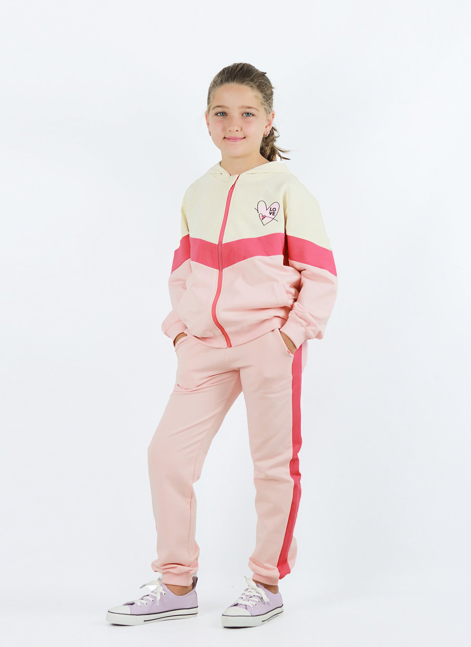 Цветен комплект с принт създадохме от мек сертифициран памук, OEKO-TEX Standard 100 с добавени полиестер и еластан, които не позволяват разтегляне на плата при лактите и коленете. Моделът е от суитшърт с качулка закопчаващ се с цип с маншети на талията и ръкавите и класическо долнище, стилен и удобен за ежедневието на децата. Съчетанието на три цвята го прави свеж, интересен и подходящ за училище, спорт и весели игри. Суитшърта може да носите отделно и като връхна дреха.