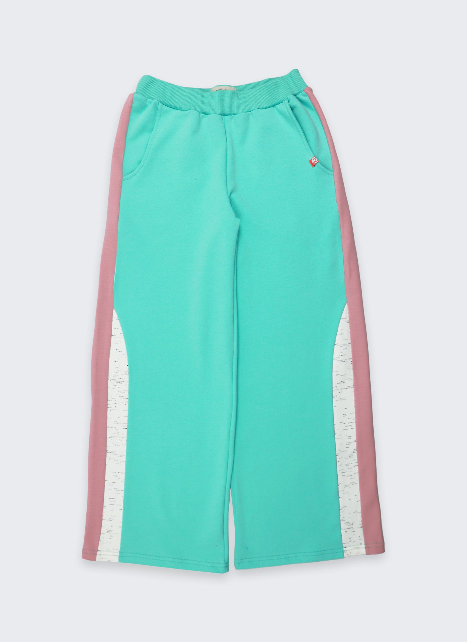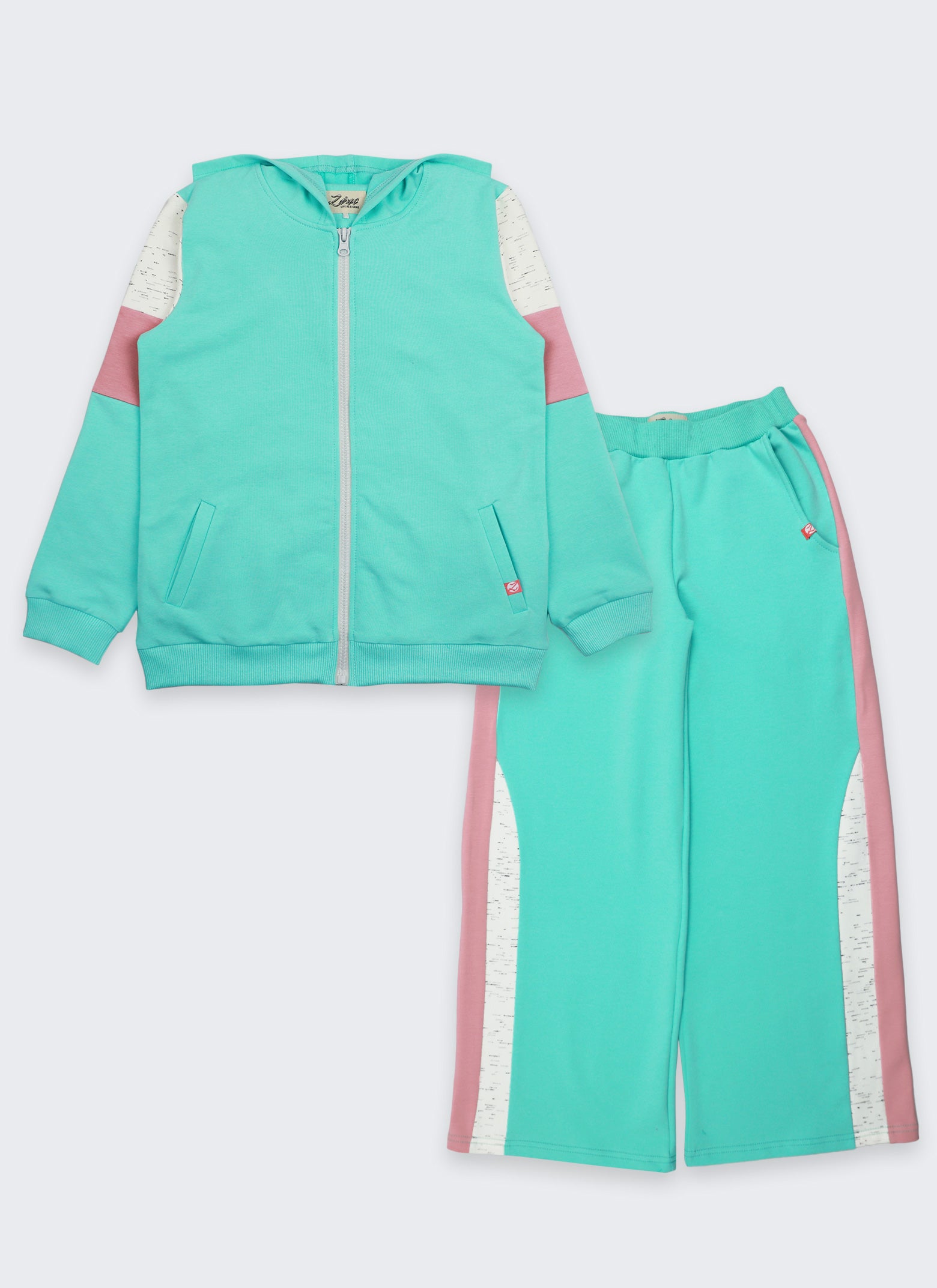 Ватиран комплект с широк панталон e изключително топъл и комфортен, което го прави подходящ за студените дни. Създаден е от мек сертифициран памук, OEKO-TEX Standard 100. Моделът е от суитшърт с качулка и цип, с маншети на талията и ръкавите, плюс така модерния широк панталон. Съчетанието на три цвята го прави свеж, интересен и подходящ за училище, спорт и весели игри. Суитшърта може да носите отделно и като връхна дреха.